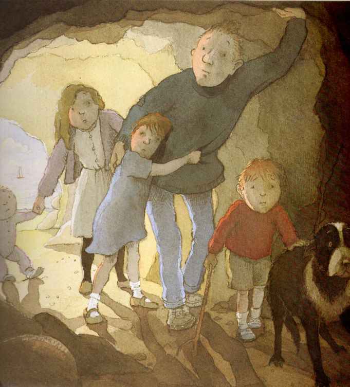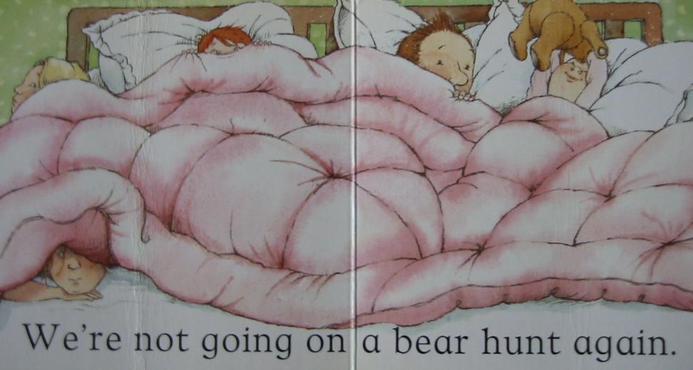 Waiting for them in the cave is the last thing they expect to find. An actual bear! They all turn around and run out, having to make their way back through all the obstacles in reverse order, making all those funny noises again, but far more quickly and with the bear running after them, back to their front door and eventually into bed and under the covers with the determination never to go on a bear hunt again.