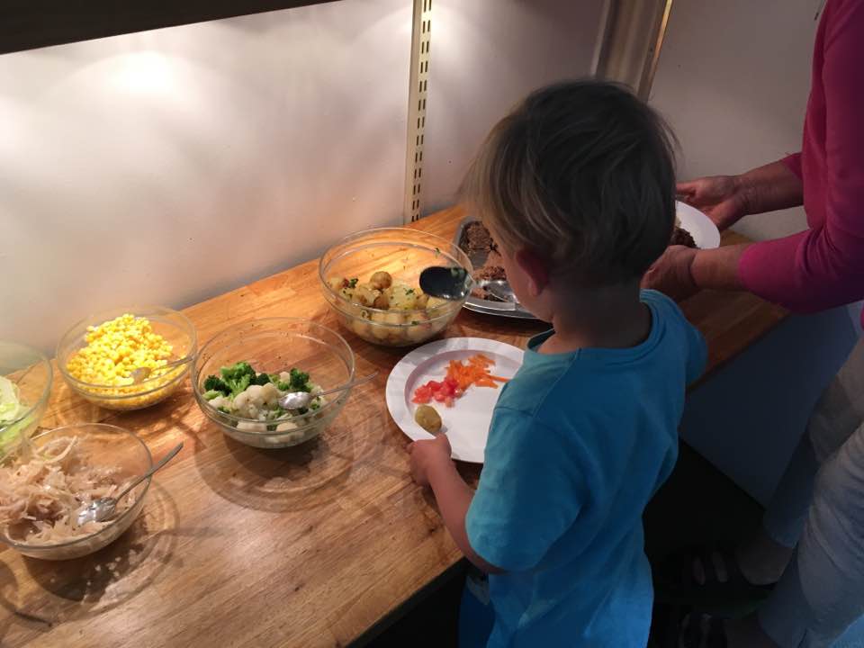 “From 2-3 years, children serve themselves at dinner time. There is no pressure to eat anything. There is always a Choice of salads and veg. Going to the dining hall is managed by the 5-6-year-olds who give out stones to those who are ready to go and eat. They don’t have to come if they are working on something. There are no puddings or processed food. Children eat around tables of about 8 with adults. They pour their own water from large jugs. The emphasis is on choice and independence.”