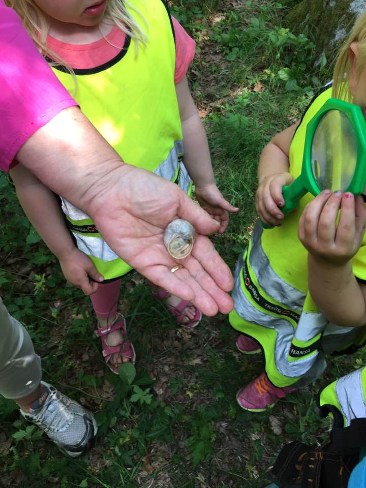 “Every day, rain, sun or snow, the children go to the forest for an hour. They are exploring snails and have their magnifying glasses ready. They draw and make patterns from the shells and the learning is driven by the children’s questions and curiosity. Back in school, they use different kinds of media to represent their investigations of snails. They are allowed to run free, climb trees and play. They sit for a snack and sing songs and share their ideas about snails and the forest and notice small changes each day in the seasonal changes.”